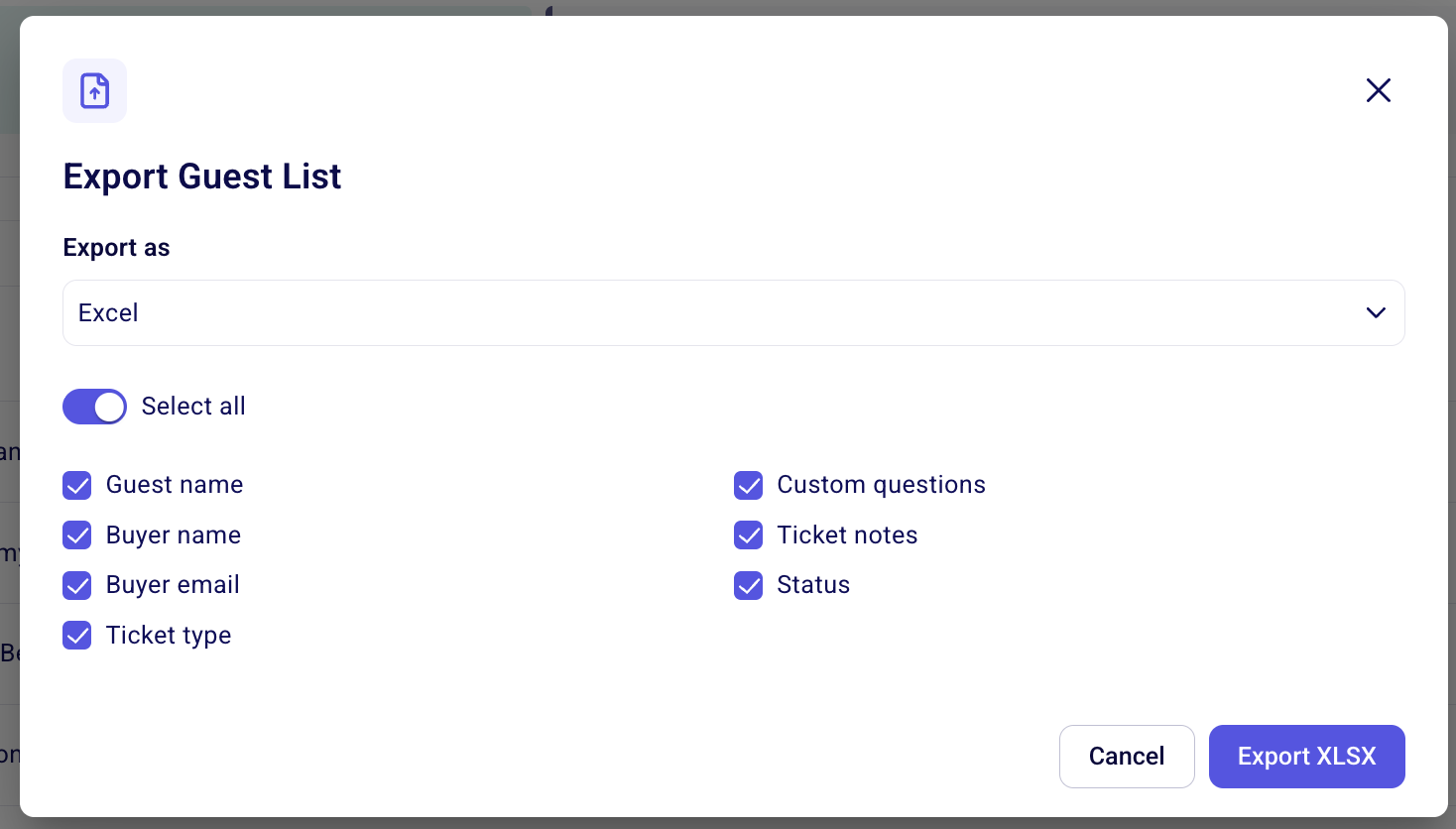When exporting your guest list, you have the option to select either PDF or Excel format from the dropdown menu at the top. Once your export is complete, you can conveniently print the file directly from your computer.