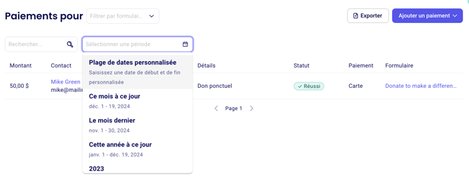 3. Filtrez votre page "Paiements" en utilisant les mêmes dates pour obtenir la liste de toutes les transactions reçues.