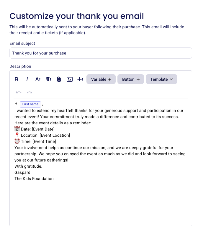 If you need to communicate your tax number to those who have purchased tickets, you can do so in the thank-you message that is sent out to your buyers.