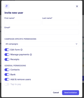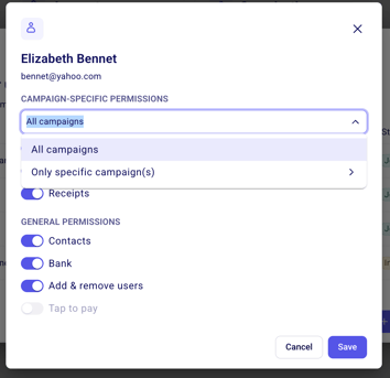 You can now also assign and manage a colleague’s access to specific campaigns and forms. To do this, click on the three dots next to the user’s name and select “Edit user.” Under “Campaign-specific permissions,” you can either grant access to “all campaigns” or limit their access by selecting “Only specific campaigns.”